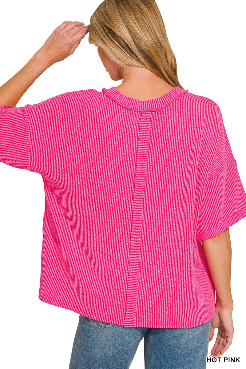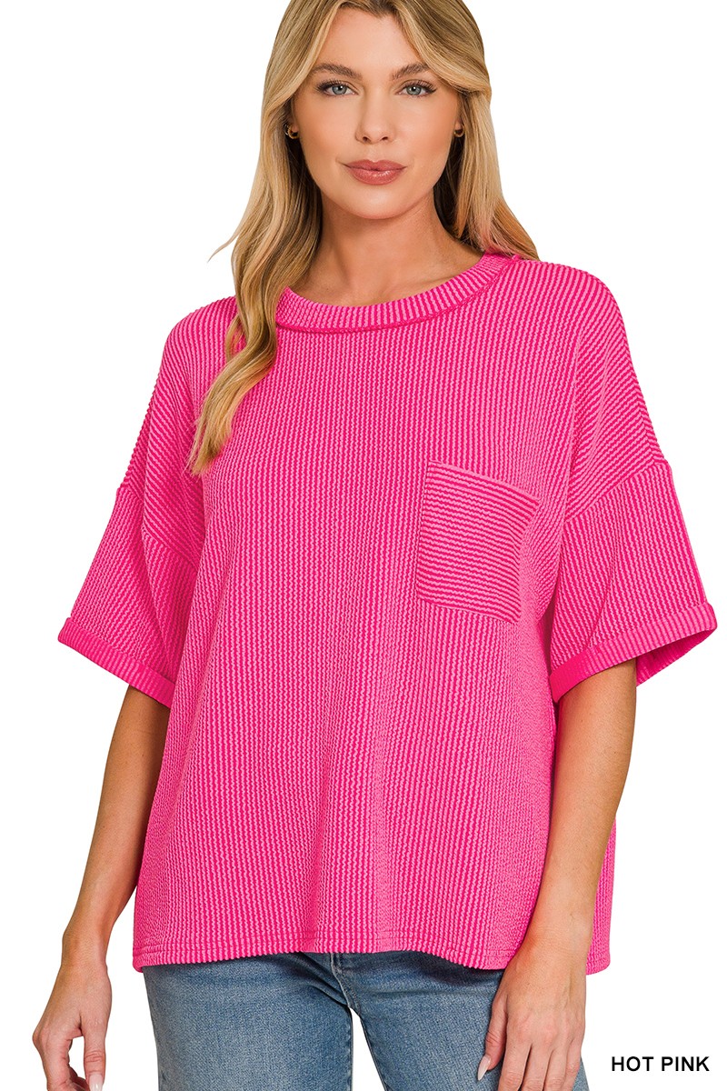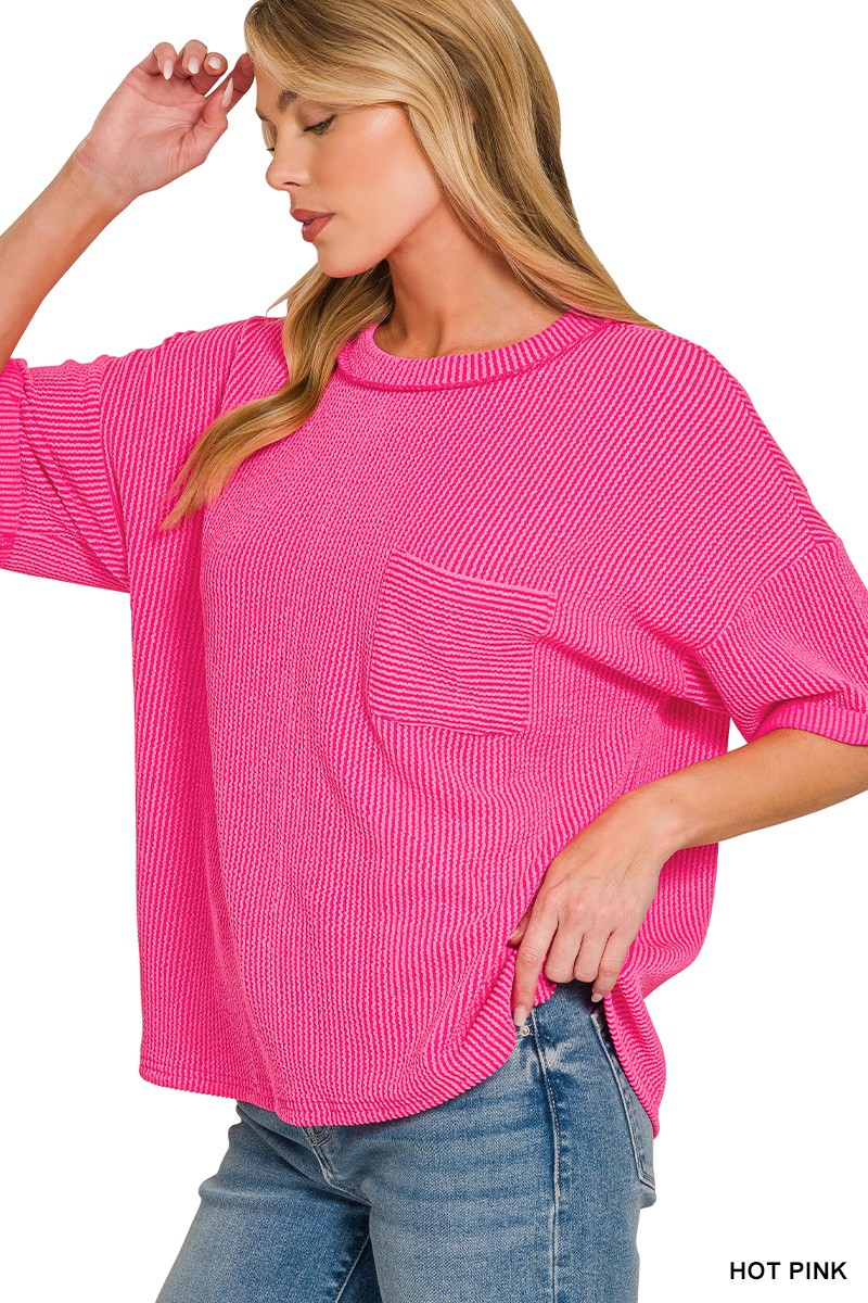 Zenana Raised Rib Short Sleeve Front Pocket Top