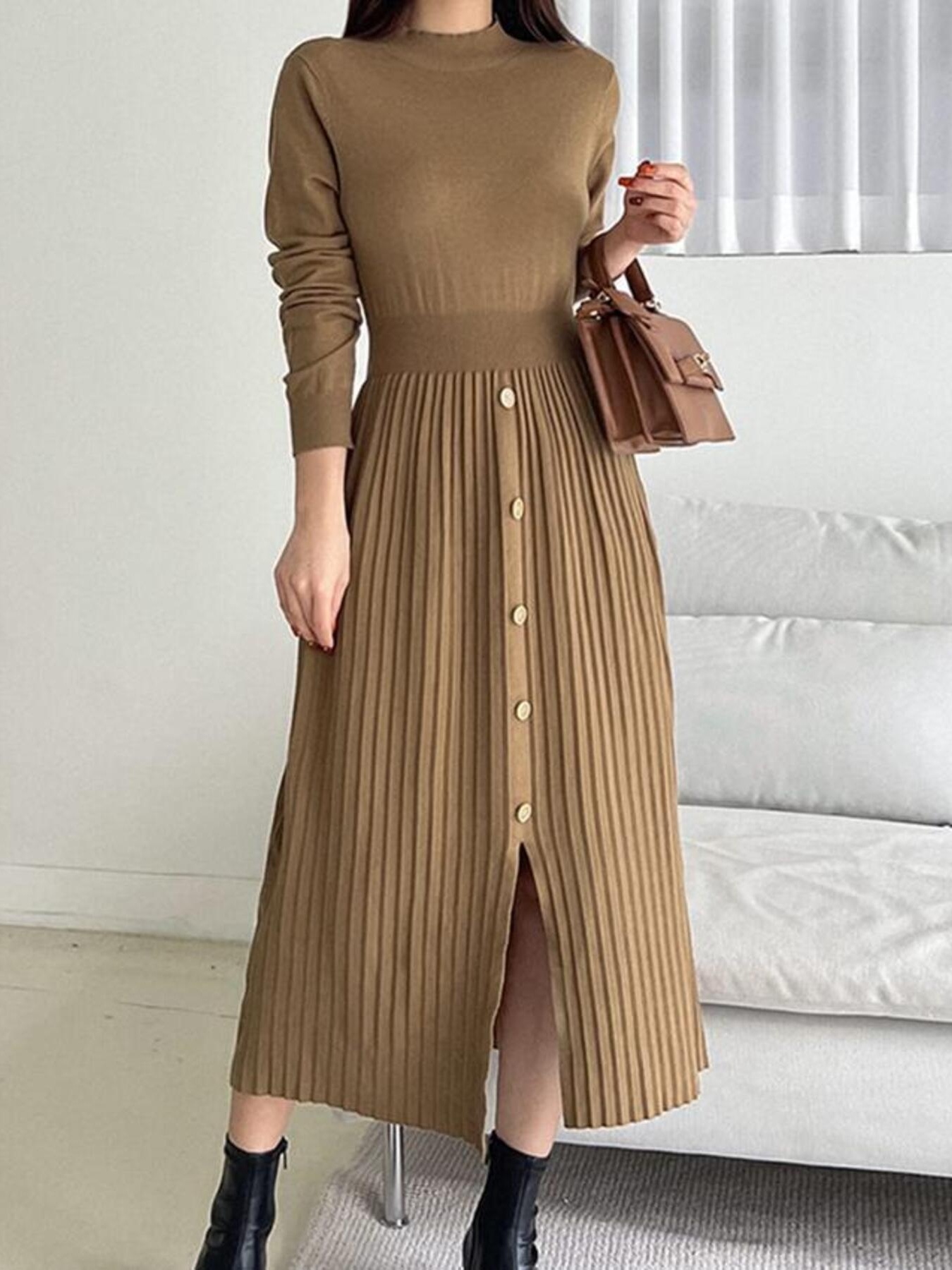 Slit Front Mock Neck Long Sleeve Knit Dress